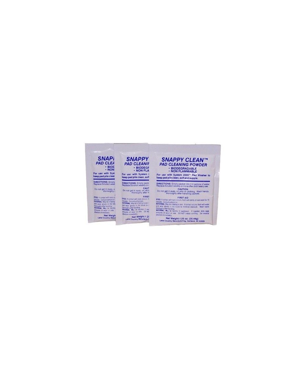 Continutul unui plic de Snappy Clean Pad Cleaning Powder se dizolva in aproximativ 11-15 litri de apa (3-4 us gallons). Scufundati pad-urile folosite in aceasta solutie, agitati putin pentru a se imbiba cu solutie si lasati-le pana la 15 minute, in functie de cat de saturate cu produs sunt.
