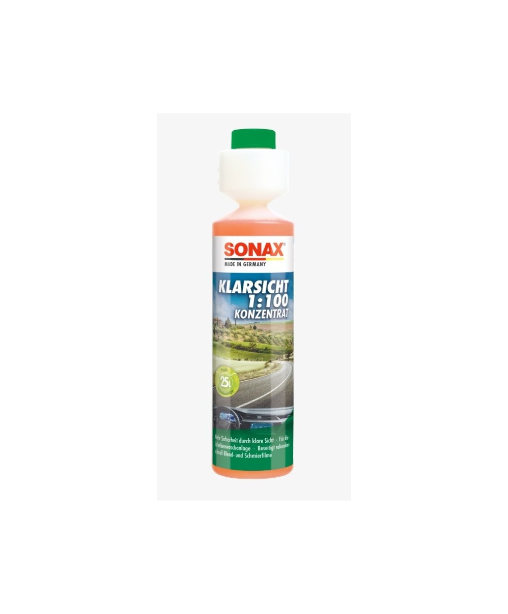 Din lichidul de spalat parbriz Sonax Klarsicht 250ml obtii 25 litri de solutie de curatat parbrizul ce va indeparta murdaria, petele de ulei si insectele fara a lasa urme.
