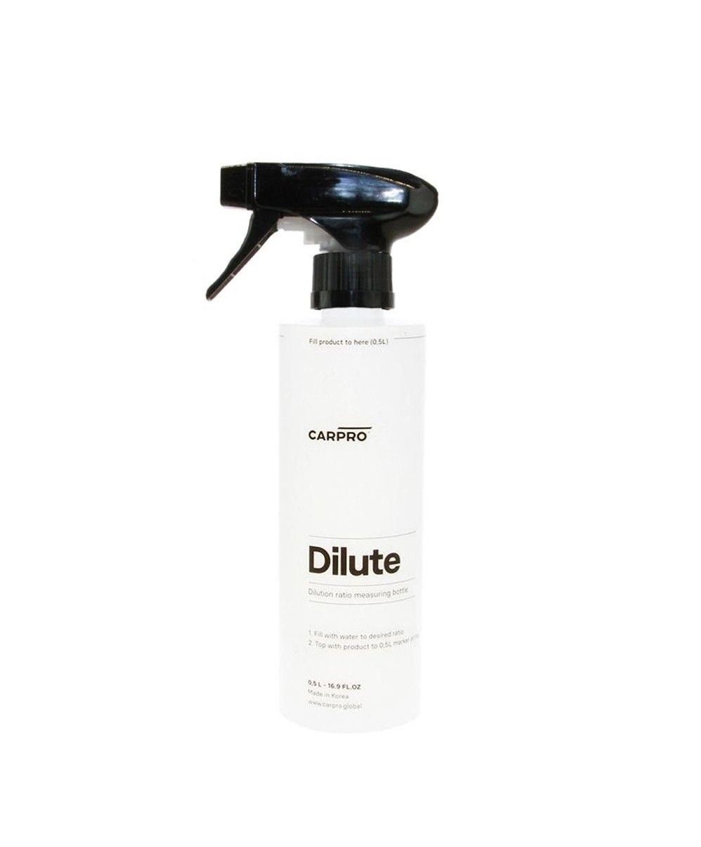 Sticla DILUTE contine dilutiile necesare preimprimate pentru toate produsele CARPRO. Pur si simplu umpleti cu apa pana la raportul de diluare dorit, apoi completati pana la linia de umplere cu produsul si dati-i o agitare buna pentru a amesteca produsul.